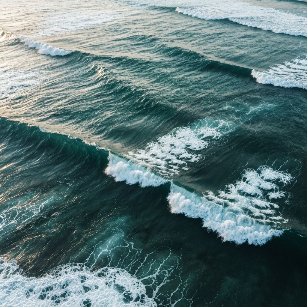 A serene ocean sunset with waves crashing on the shore